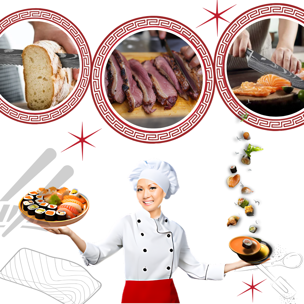 Variants: Chef Knife | Bread Knife | Slicing Knife | Big Santoku Knife | Small Santoku Knife | Paring Knife | Cleaver Knife | Boning Knife | Kiritsuke Knife | Utility Knife | Set of 10 Knives